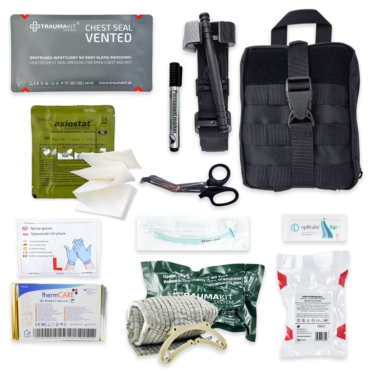 Apteczka zawiera zarówno wysokiej klasy materiały opatrunkowe  jak i elementy kluczowe dla przeżycia poszkodowanych, którzy ucierpieli w wyniku ran penetracyjnych. Wyposażona została w opaskę zaciskową CAT, zapewniającą kompletne zabezpieczenie masywnych krwotoków.