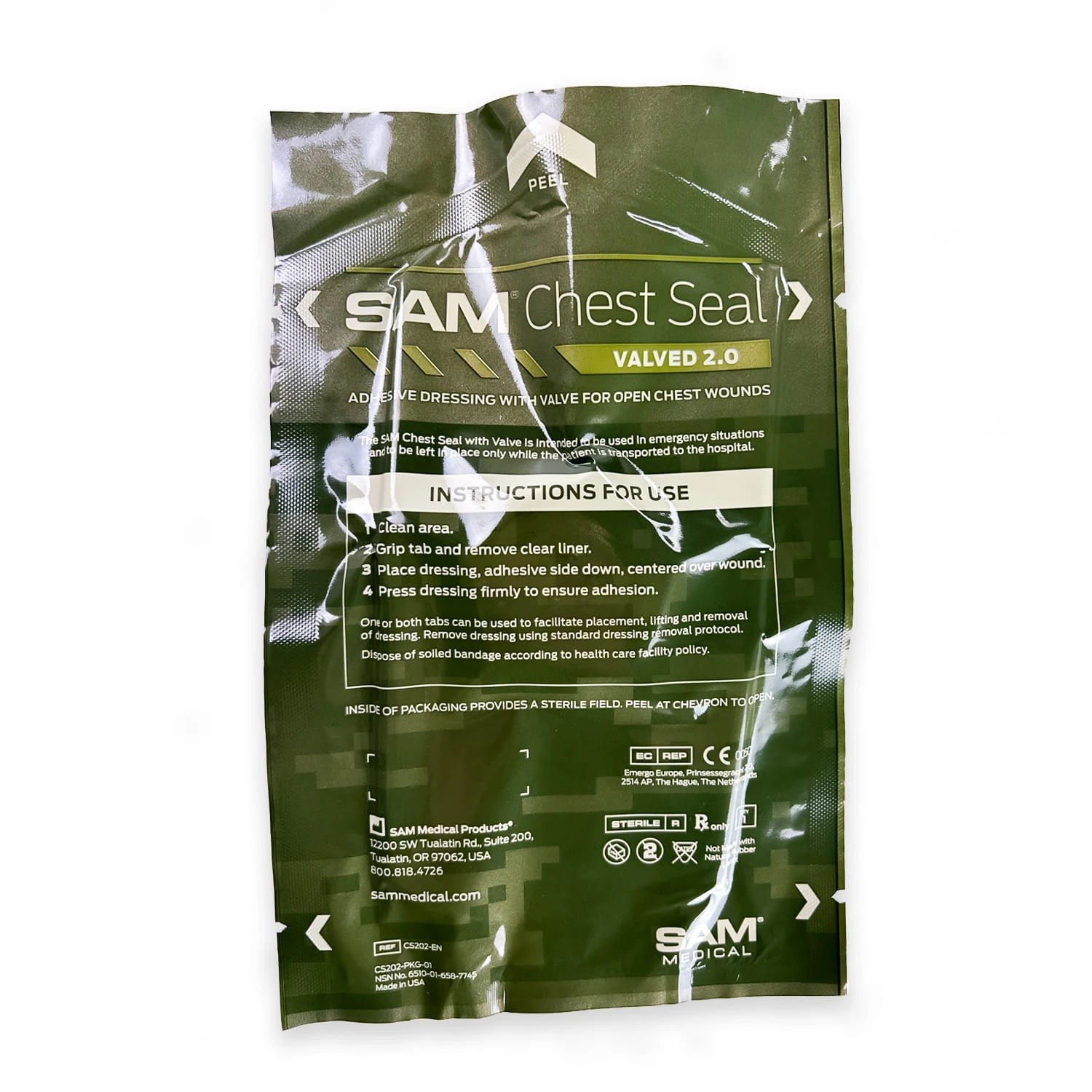 SAM Chest Seal to wysokiej jakości opatrunek wentylowy z zaworem, który został zaprojektowany do leczenia trudnych ran penetracyjnych klatki piersiowej. Wykorzystując silny adhezyjny hydrożel, opatrunek efektywnie przylega nawet w obecności krwi, piasku, podczas zanurzenia w wodzie, oraz w ekstremalnych warunkach ciepła i zimna. Opatrunek jest elastyczny, co pozwala mu dopasować się do kształtu rany.