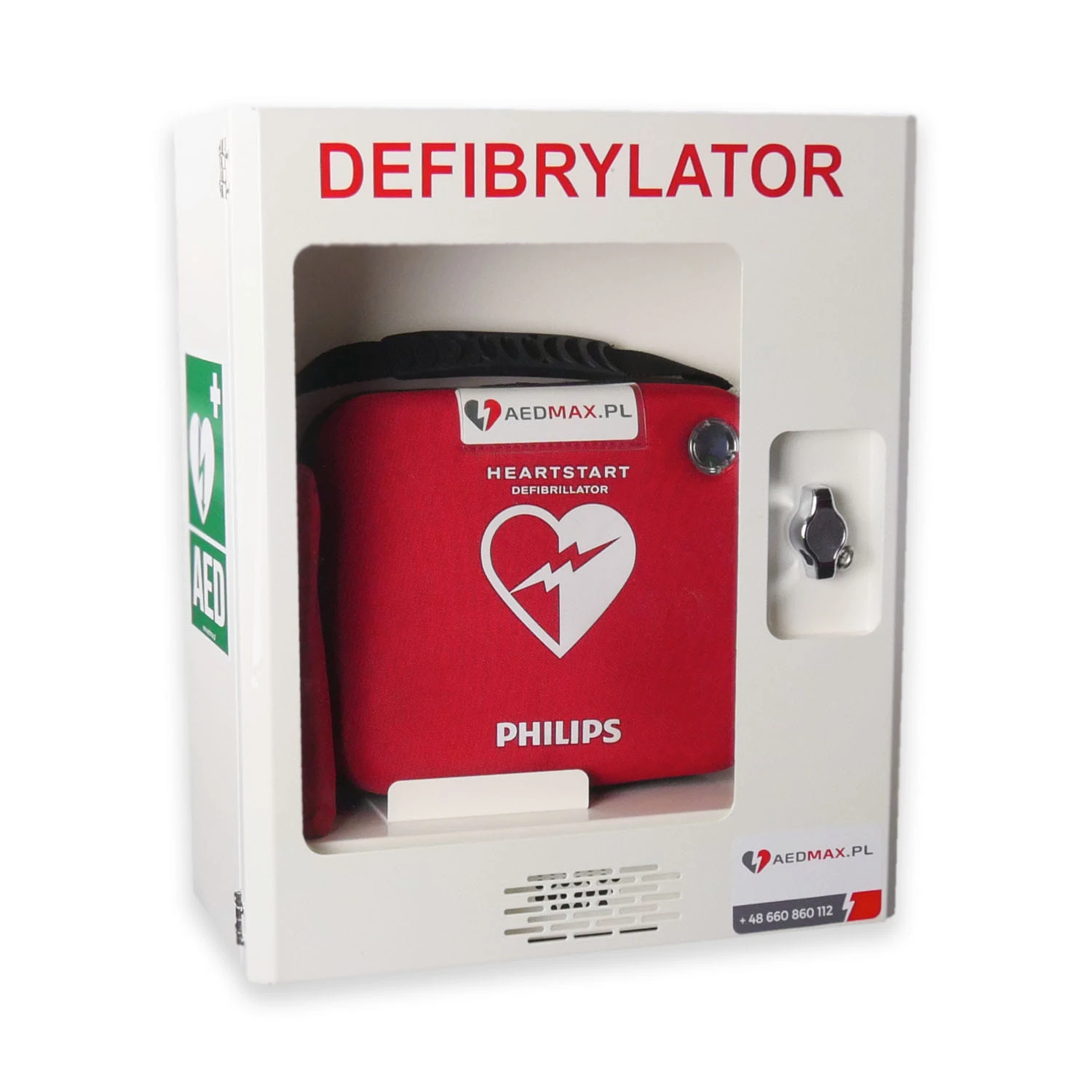Zastosowanie przeszklenia w drzwiach szafki umożliwia stałą kontrolę stanu defibrylatora bez konieczności wyjmowania go na zewnątrz. Dzięki temu rozwiązaniu można mieć pewność, że AED sygnalizuje prawidłowe działanie podzespołów i części zużywalnych, jak elektrody i bateria, i jest gotowy do pracy.